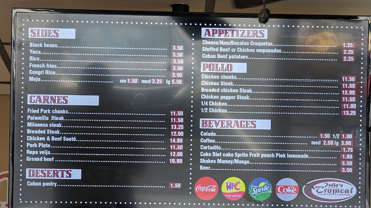 - Sides: Includes staple Cuban accompaniments such as Congri rice (Arroz Congri), black beans (Frijoles Negros), caramelized plantains (Platanos), white rice (Arroz), yuca topped with onions and black pepper, and Mojo sauce available in small and large portions.
