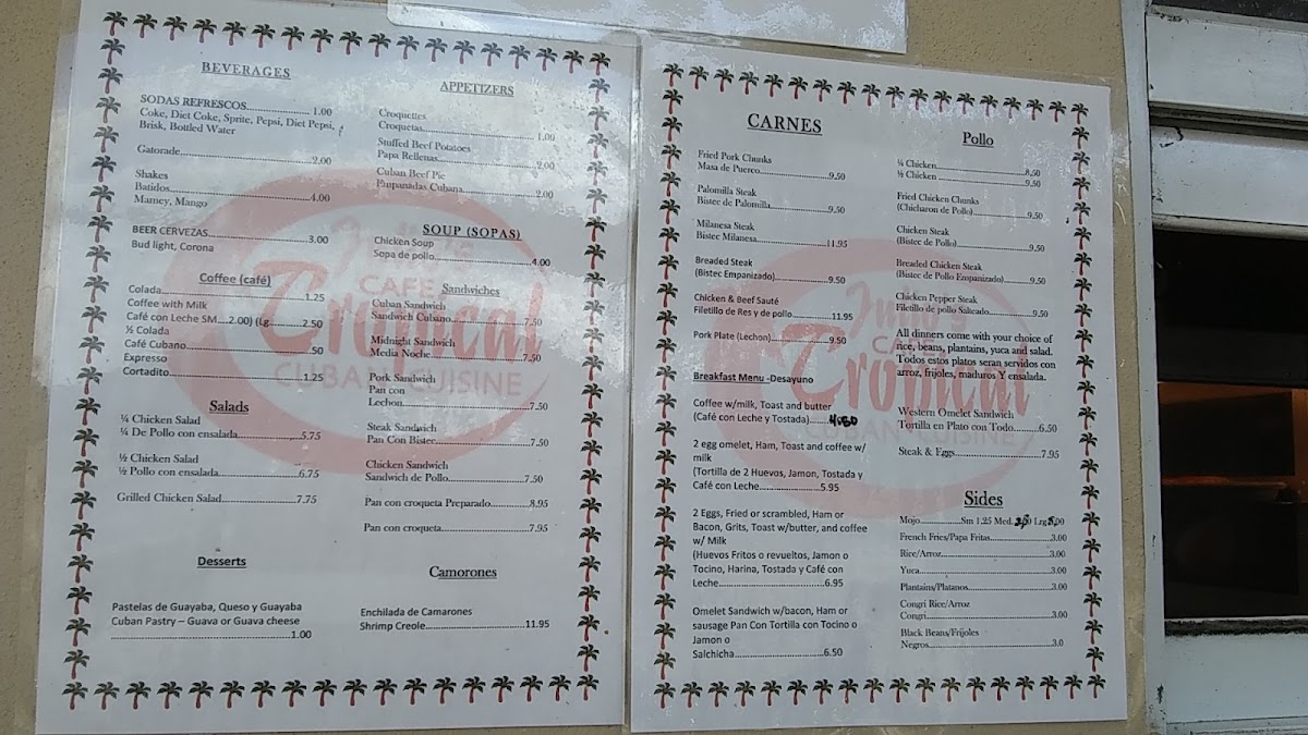 The menu offers a variety of traditional Cuban dishes with options that cater to both breakfast and lunch. It is organized into several key categories for ease of selection.