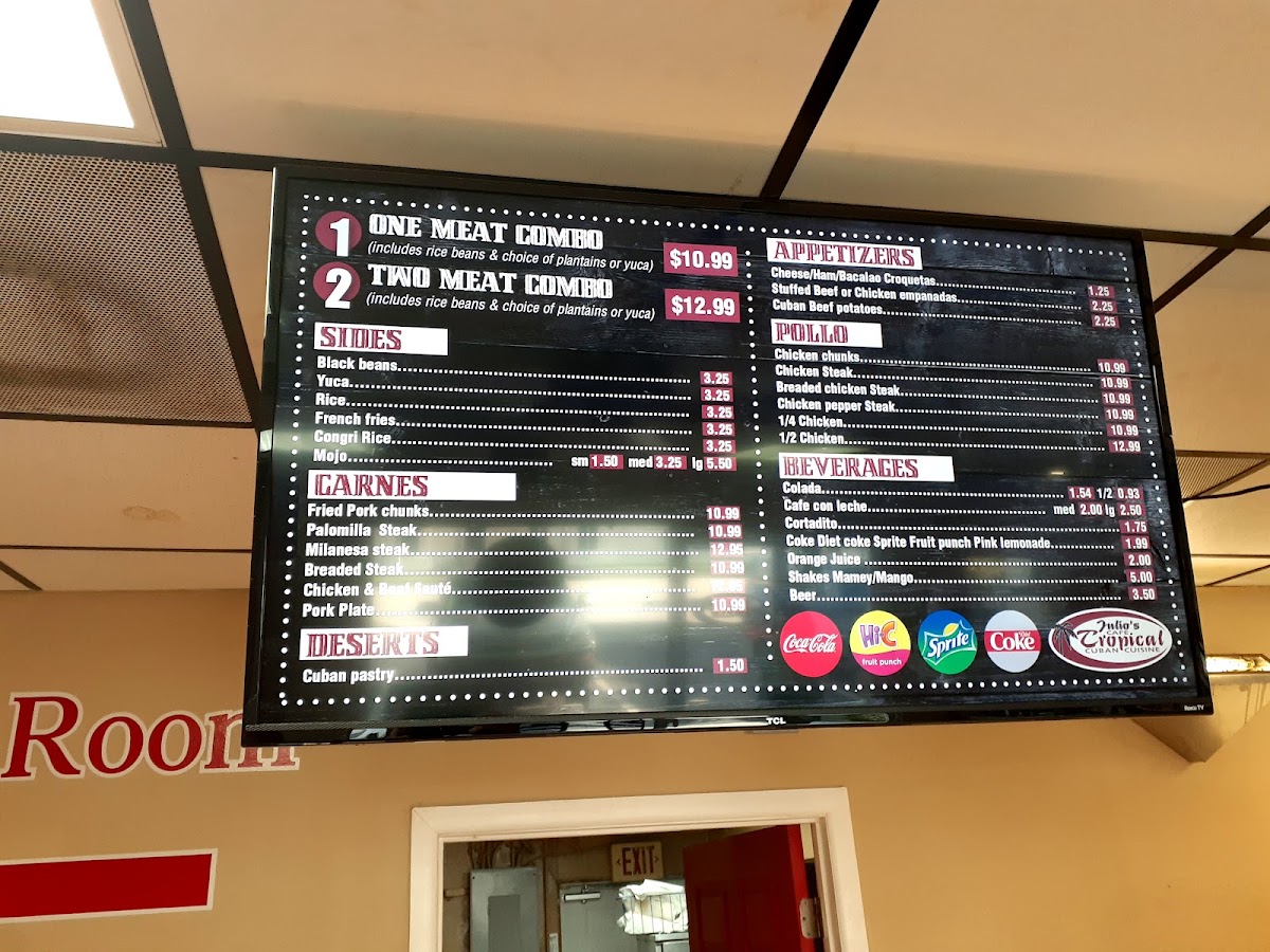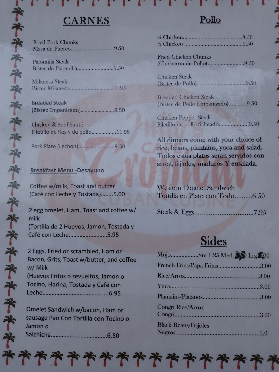 - Carnes (Meat Plates): Features Cuban-style proteins including Palomilla steak (Bistec De Palomilla) served with sautéed onions and choice of rice and sides, pork plates accompanied by rice and beans, plantains, yuca, or salad, as well as fried pork chunks.